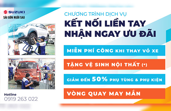 Nhằm tri ân Quý khách hàng đồng hành trong suốt thời gian dài và để Quý khách khách hàng chăm sóc chu đáo hơn cho "xế yêu" của mình, Suzuki Sài Gòn Ngôi Sao thực hiện chương trình dịch vụ "KẾT NỐI LIỀN TAY - NHẬN NGAY ƯU ĐÃI" ưu đãi đặc biệt một số hạng mục cho xe du lịch và xe tải suzuki cụ thể như sau: